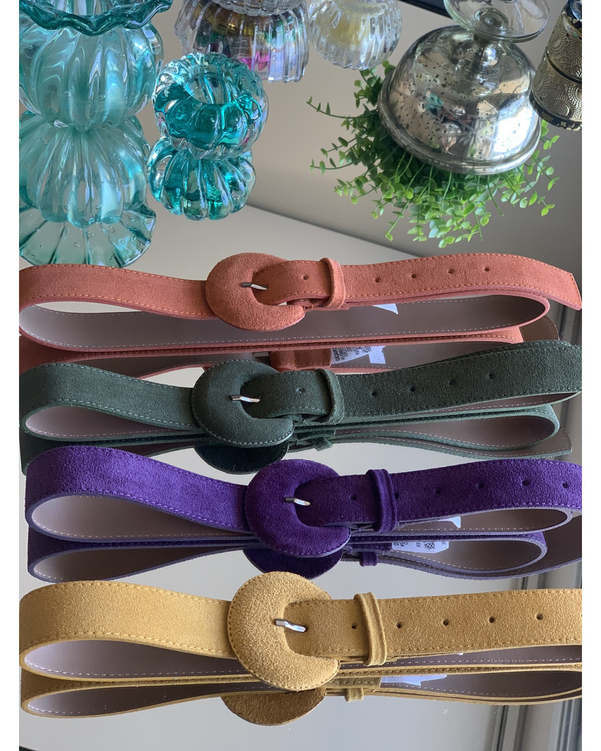 Cinto em camurça, fivela meia lua também em camurça.