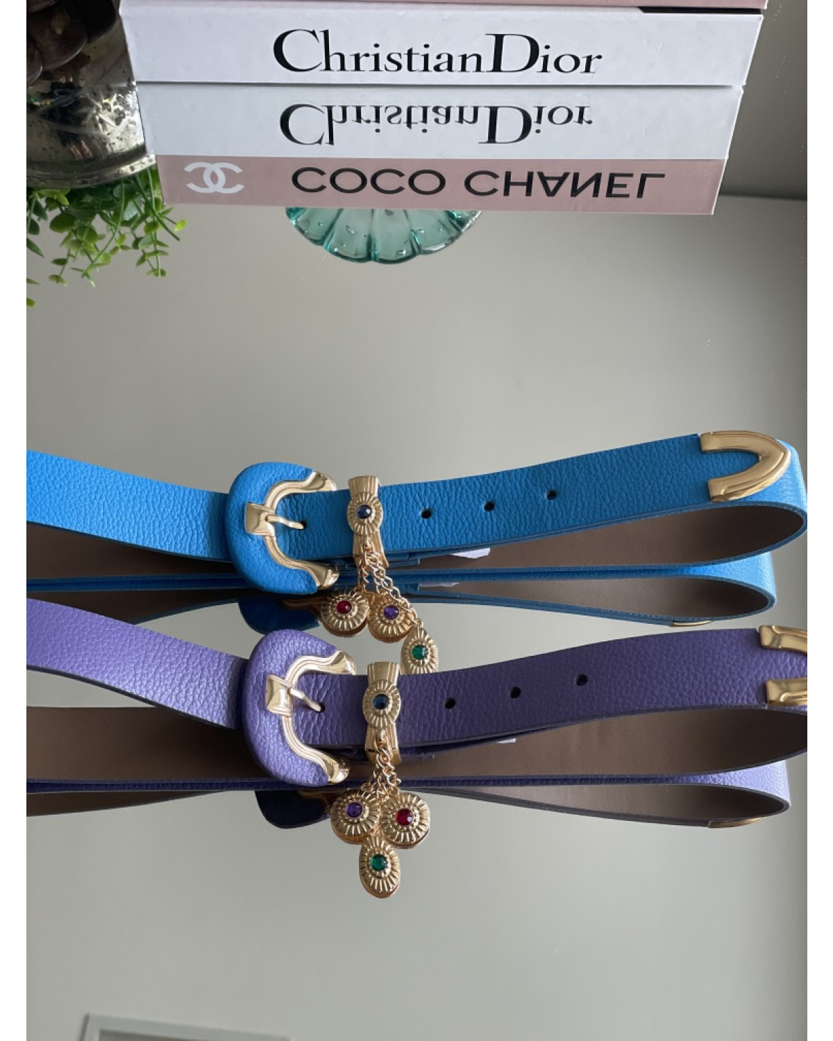 Cinto em couro, com detalhes de pingentes dourados na fivela.
