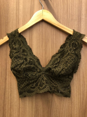 Top em renda, com alças regulavéis, sem bojo, modelagem alongadinha.