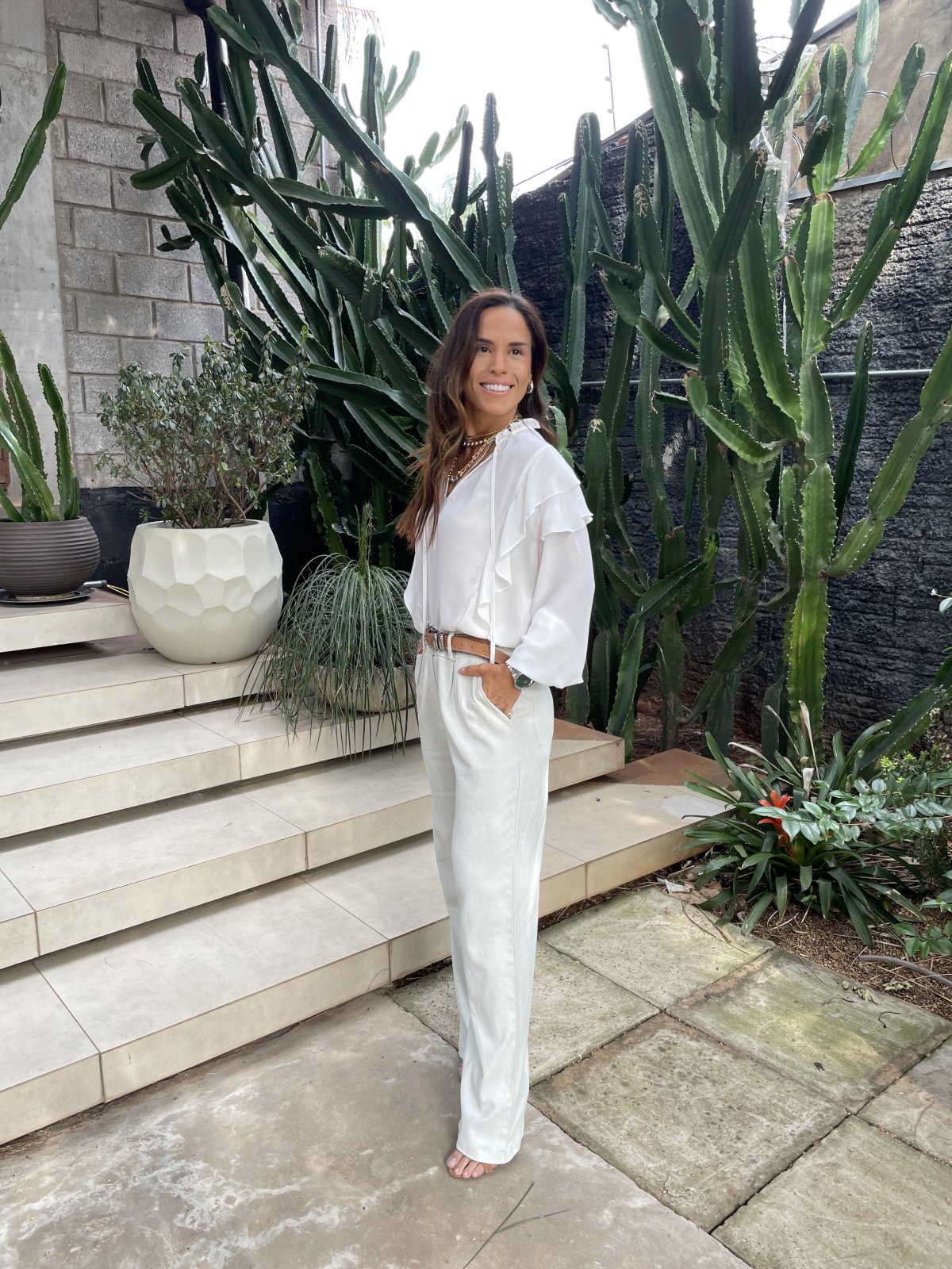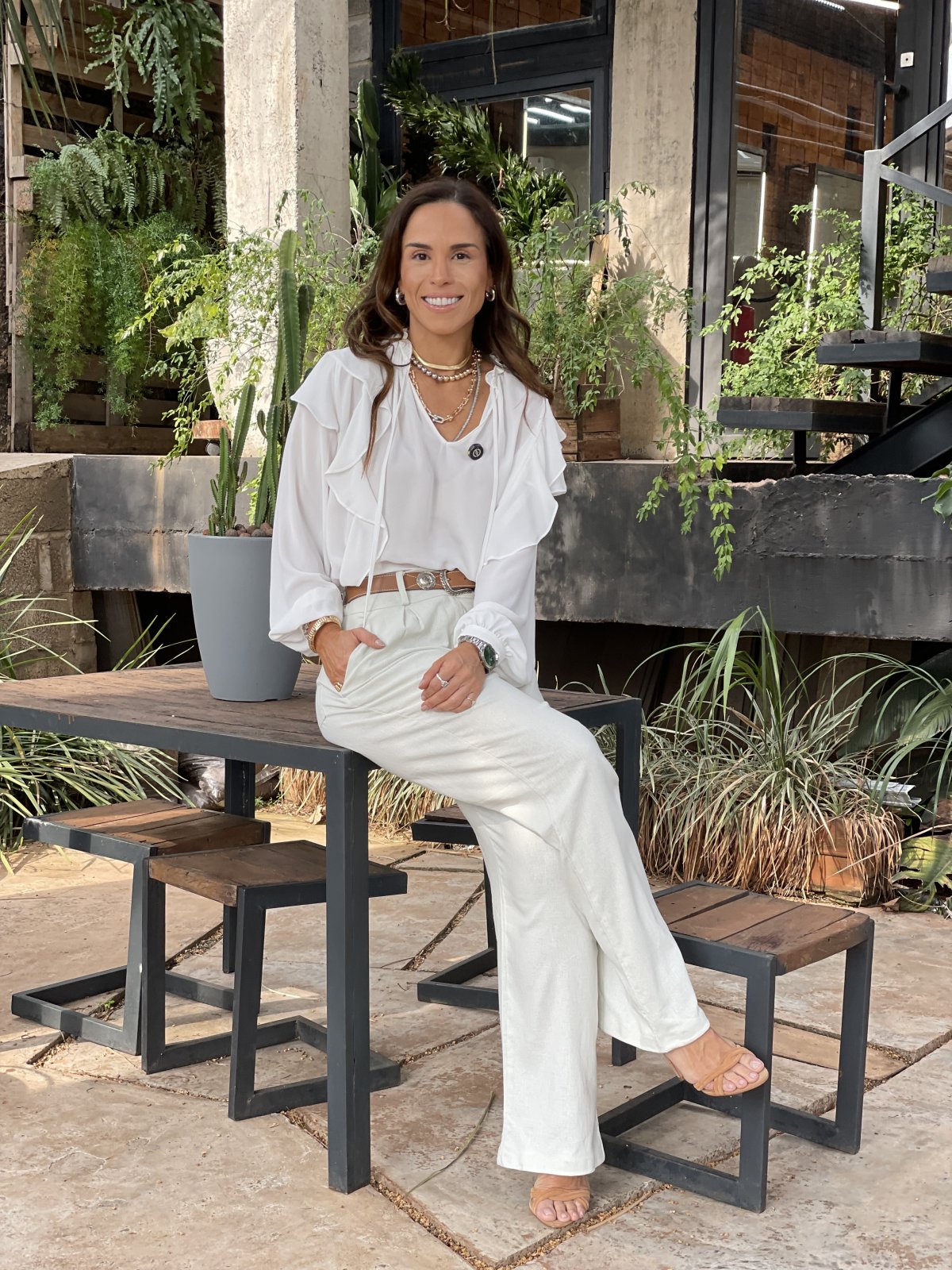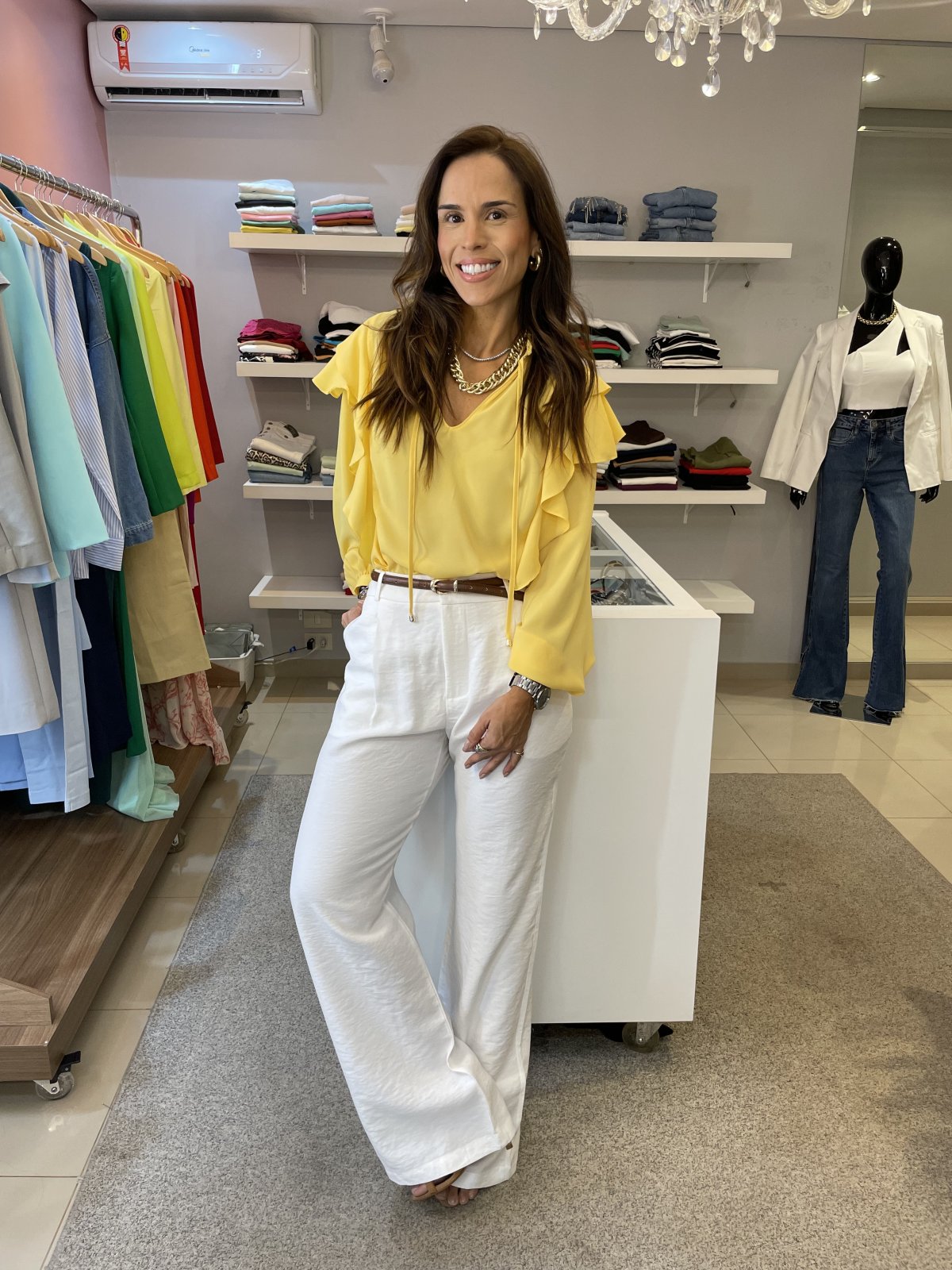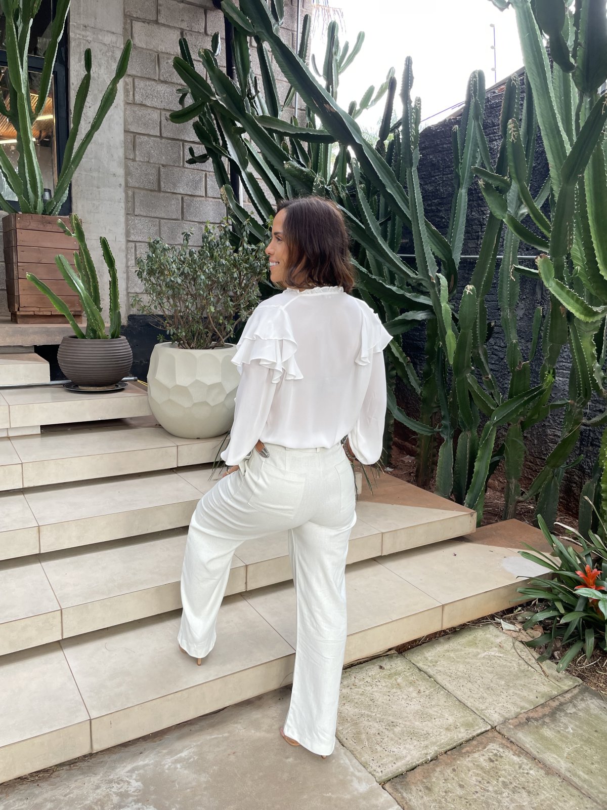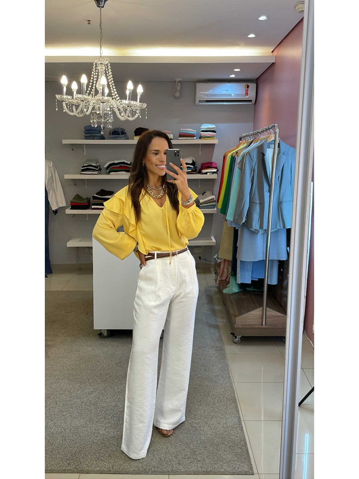 Blusa em tecido crepe chiffon, manga longa com fechamento em botão, leve babado nos ombros e na parte da frente e gola com amarração.