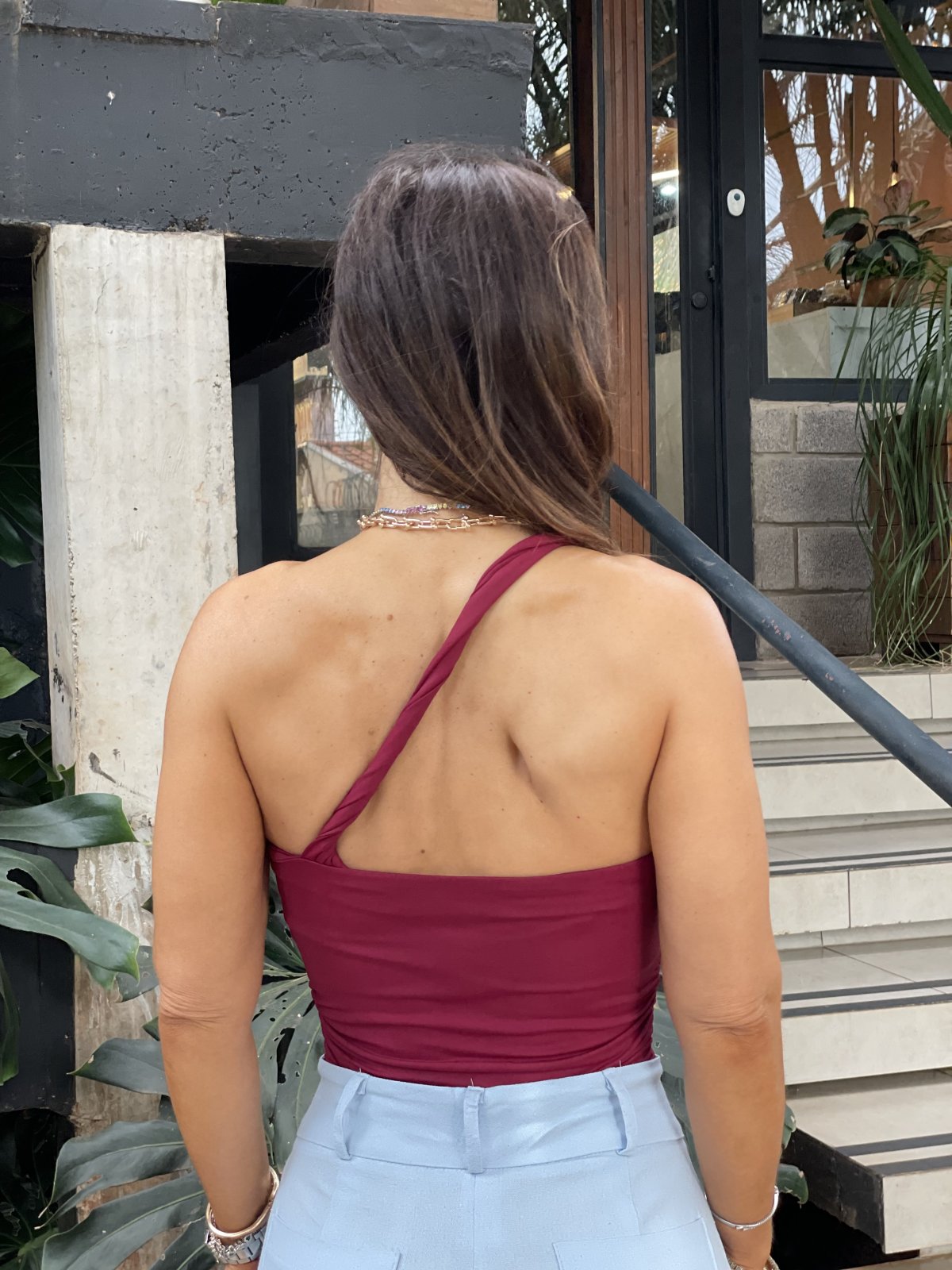 Cropped malha encorpada de gramatura média, com alta elasticidade, modelagem justa, valoriza o busto, o ponto alto fica por conta da alça única com torção e o decote assimétrico