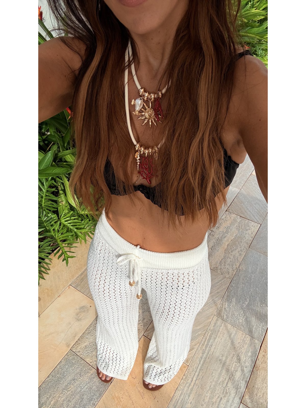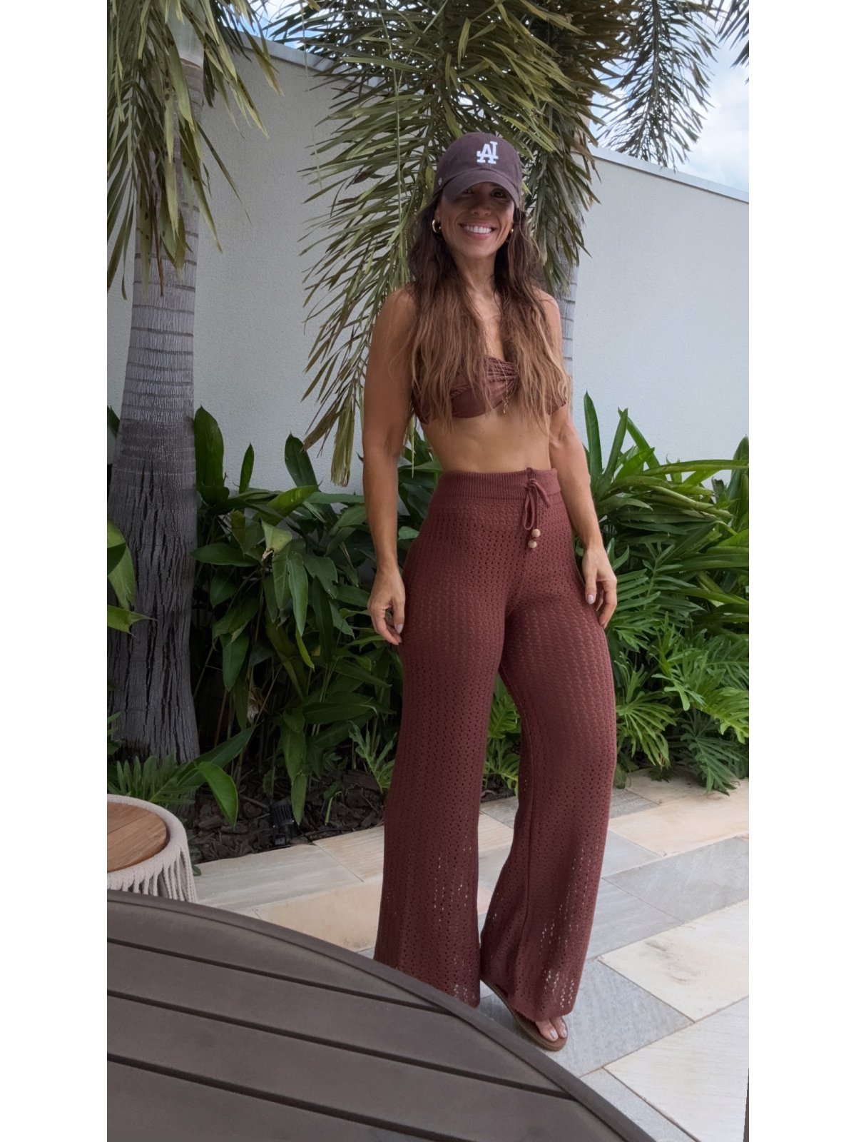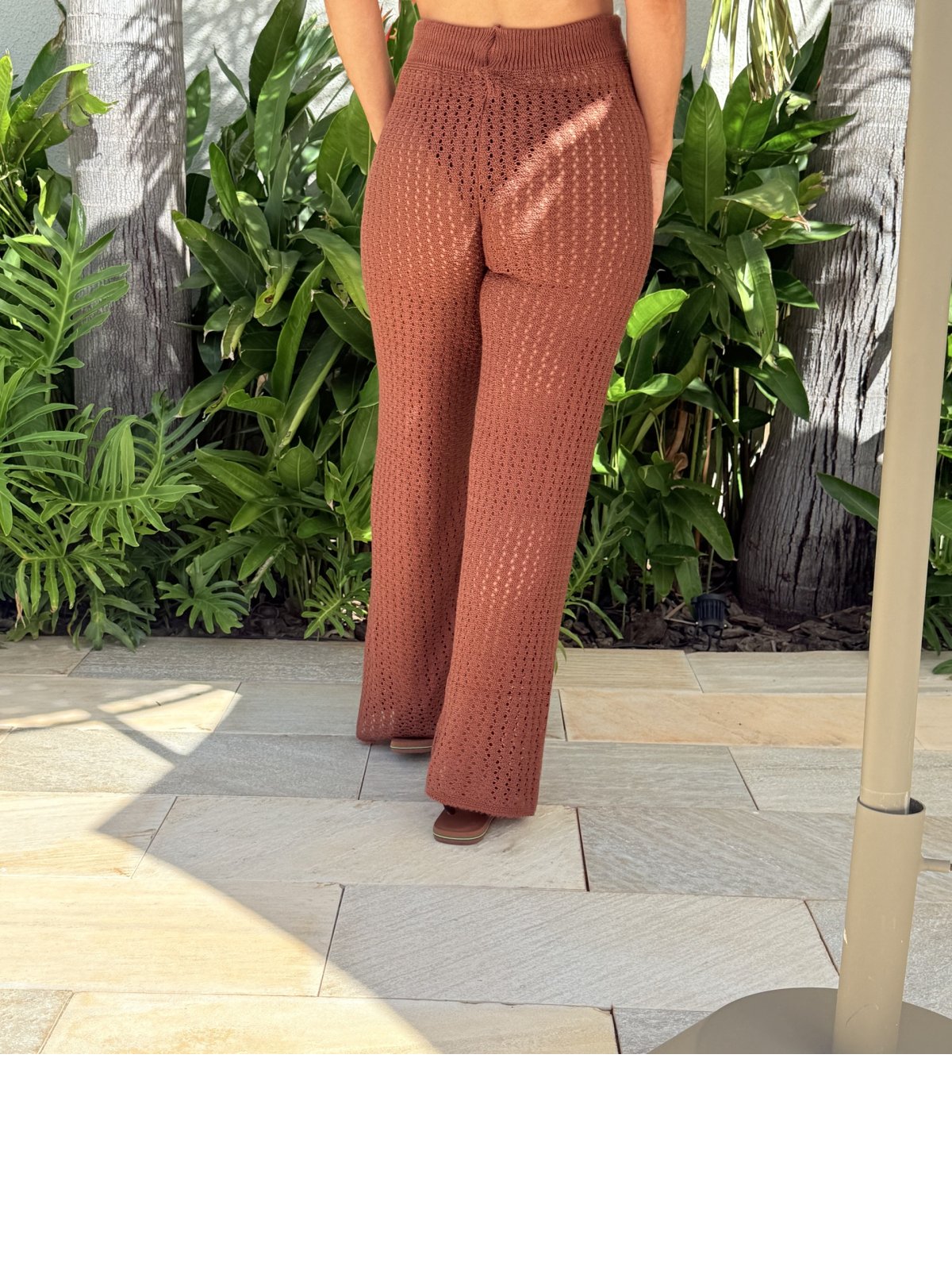 Calça em tricô, confeccionada manualmente, cós de elástico, com cordão para ajuste, ideal para usar em looks de praia.