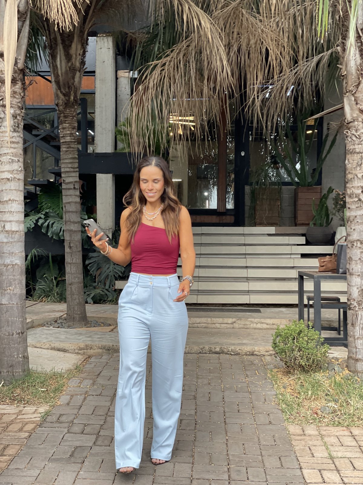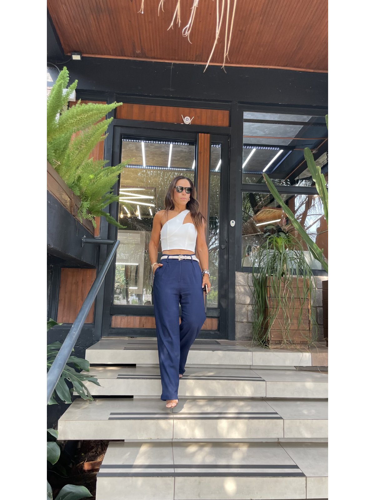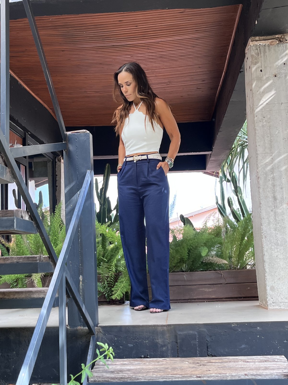 Calça em linho misto, bolsos faca nas laterais, possui passantes, botões duplos, e dois bolsos na parte de trás da calça.