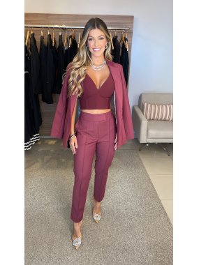 Calça em alfaiataria, cós alto, fechamento de zíper na frente e bolsos nas laterais, detalhe de fenda na barra.